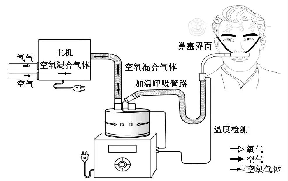 HFNC是指一種通過高流量鼻塞持續(xù)為患者提供可以調(diào)控并相對(duì)恒定吸氧濃度(21%~100%)、溫度(31~37 ℃)和濕度的高流量(8~80 L/min)吸入氣體的治療方式。該治療設(shè)備主要包括空氧混合裝置、濕化治療儀、高流量鼻塞以及連接呼吸管路[3]。結(jié)合國(guó)內(nèi)和國(guó)際通用命名習(xí)慣,本共識(shí)統(tǒng)一采用"經(jīng)鼻高流量濕化氧療"進(jìn)行表述,英文簡(jiǎn)稱為HFNC(圖1)。