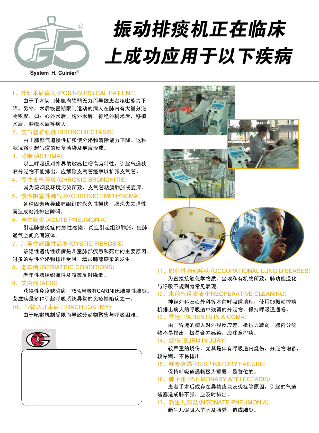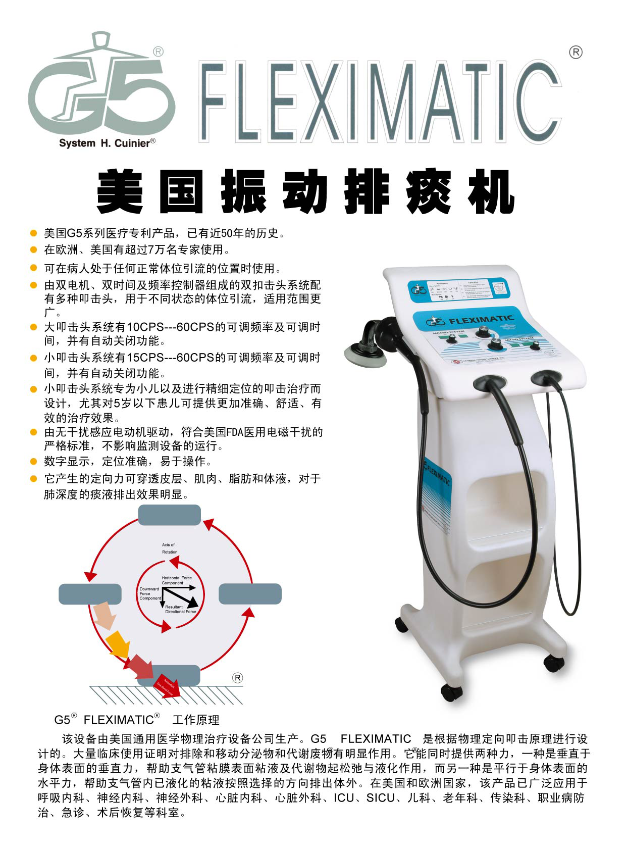美國(guó)G5振動(dòng)排痰機(jī)是根據(jù)臨床胸部物理治療原理(定向體位引流),在人體表面產(chǎn)生特定方向周期變化的治療力,該定向治療力穿透性強(qiáng),可穿透皮層、肌肉、組織和體液,其垂直方向分力產(chǎn)生的叩擊、震顫可促使呼吸道粘膜表面粘液和代謝物松弛、液化,使其變小變松。